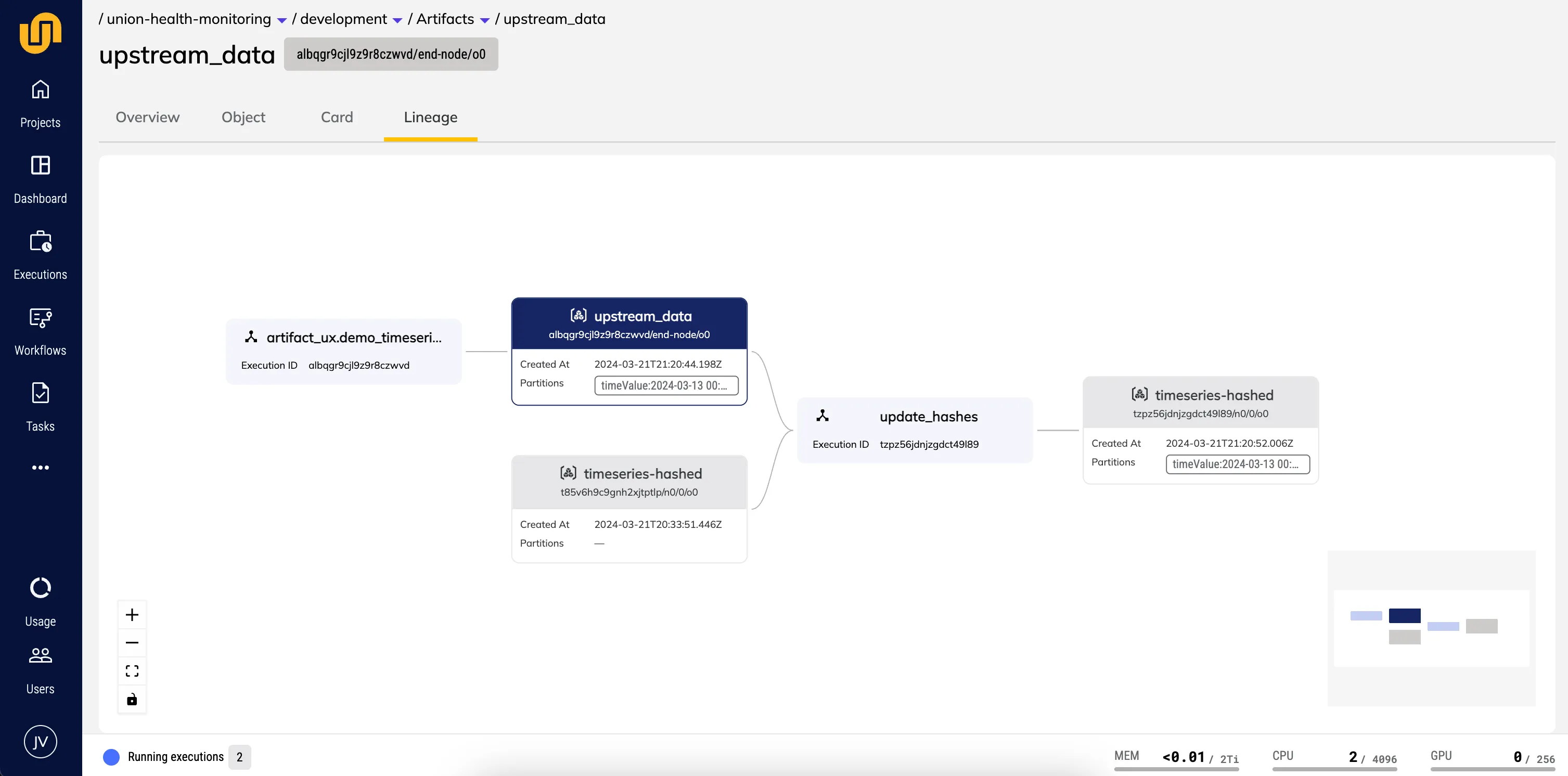 Union, which is based on Flyte, stores strongly typed inputs and outputs and abstracts the data flow from users within the scope of a workflow. Immutable entities and automatic versioning make it easy to understand lineage within a single workflow. Artifacts builds on this foundation by tracking cross-workflow dependencies and elevating these inputs and outputs to first-class entities, enabling new development paradigms such as modular workflows, smart defaults for workflow inputs via partitions, and event-based workflow reactivity via triggers.