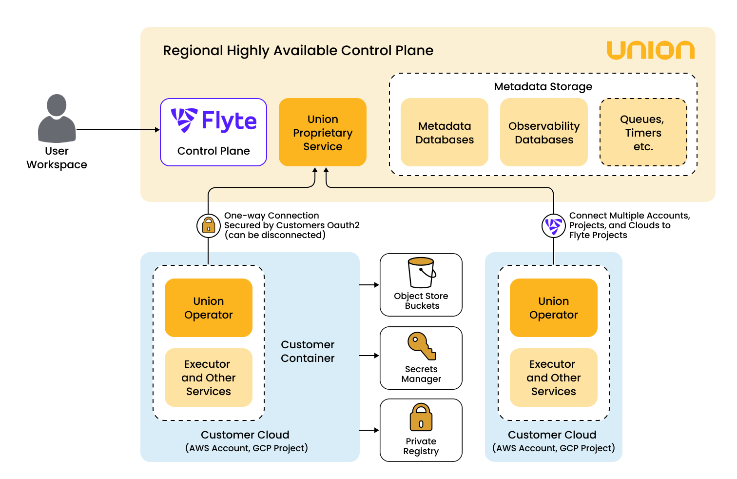 Management of the data plane is mediated by a dedicated operator (the Union.ai operator) resident on that plane. This operator is designed to perform its functions with only the very minimum set of required permissions. It allows the control plane to spin up and down clusters and provides Union.ai’s support engineers with access to system-level logs and the ability to apply changes as per customer requests. It does not provide direct access to secrets or data.